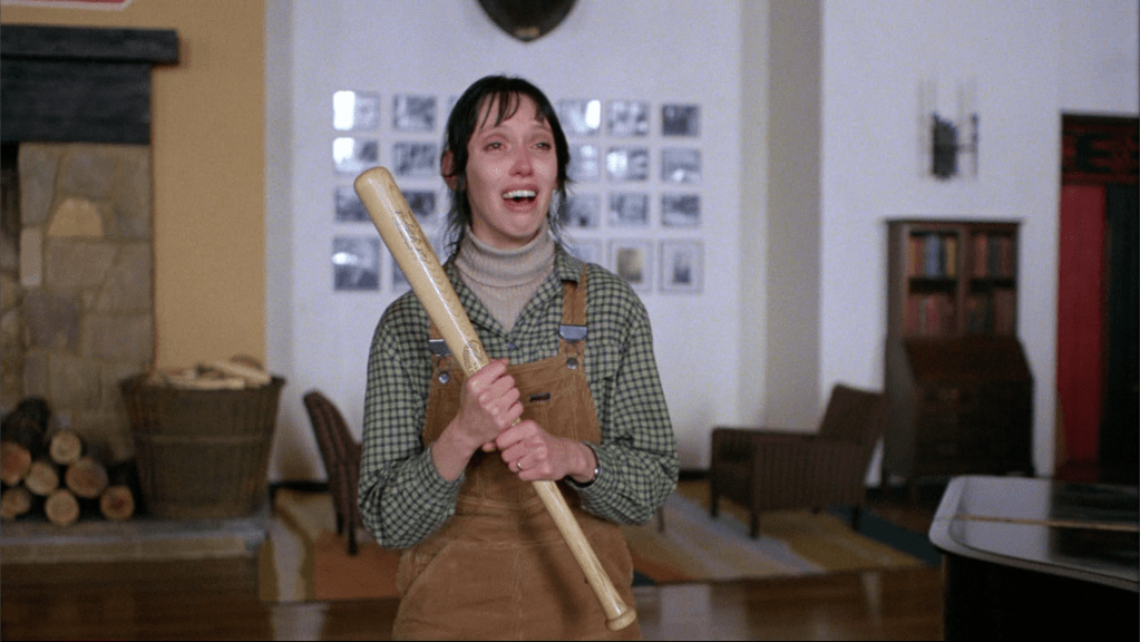 So it’s apt that the last we see of “identity” is the moment that Jack makes his threats on his wife’s life official. He’s officially embarking on his quest for the hotel to take him in its loving arms forever and ever. Casting off his former identity as a non-murderer. (You might also want to read my section on mirror phrases for an appreciation of how much twinning is going on in this scene. With that section in mind, it’s Jack’s “whole fucking life” line that kicks off Wendy’s retreat into her own repetitious phrases of “Stay away from me!” and “Don’t hurt me!” So, once “identity” has left the building, Wendy turns into her own kind of self-twinning machine.)