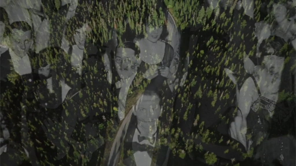 …well, much later in the film, while Wendy’s trying the radio that doesn’t work, there’s two photo-postcards showing beautiful mountain shots (like the one you see below), pinned to a wooden bannister by Wendy’s face (one of which was photographed by one Francis Kies (which sounds like “keys” in English)). Above these is a montage of black and white faces (see second image below). Across from these is a letter pinned to a cork board, wedged slightly open (see below in the second red box).