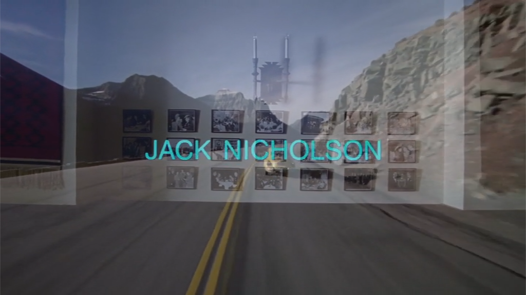 In this overlay, Going-to-the-Sun Road makes a winding curve that seems to flow through photo Jack’s face, somewhat resembling the bloody curve that winds through the face of the GREAT PARTY ghost, who, in that moment, is wearing the same outfit as photo Jack here. (Note that the ghost is holding ghost booze in the same hand as photo Jack is holding his little secret message, as we’ll see more clearly in a few shots.)