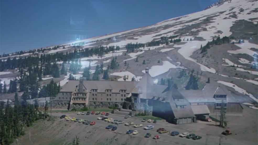 During a good chunk of the opening shot of the hotel, we see Danny and Wendy fleeing past the exterior for the last time. The overlay effect gives the night-vision Overlook a ghostly appearance as it floats above the drab, ordinary building of the intro.