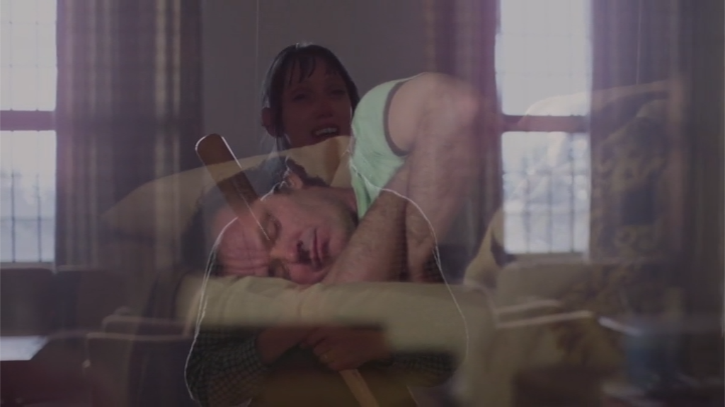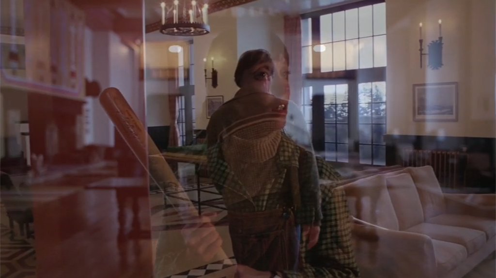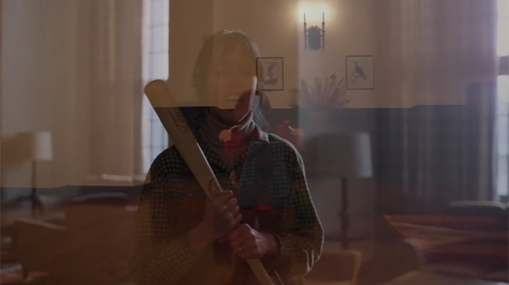 Backward Wendy is spinning around, terrified with a weapon in her hand, and she’ll do that again with the GREAT PARTY ghost, near the end. Actually, there’s a bit of an absurdity here, because we’ve just seen Wendy rifling madly through the pages, looking for some sign of a joke, or some bottom to the madness of her husband, and when he speaks from behind her, she shrieks and spins around, with the bat in her hands. But we saw her hunched with the papers. So she either moved lightning fast, or…magic. But you know, that does kinda speak to the way Wendy flips around on the GREAT PARTY ghost without hearing or seeing him behind her.