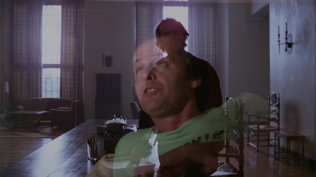 Wendy asks Jack if he’s had any ideas, and he replies, “Lots of ideas. No good ones.” This overlays with Jack stamping his one-sentence Great American Novel with pride, and asking “What do you wanna talk about?”