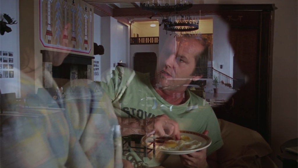 This is just hilarious. Jack barking at Wendy (3 times, in fact) about whether or not she’s ever had a “single. moment’s. thought.” about his responsibilities to his employers, overlaid with this image of Wendy, the first image we see after Ullman and all the others have left. She’s not only contemplated Jack’s responsibilities, she’s gotten up well ahead of him, to cook him a gorgeous breakfast, and even goes easy on him about waking up at 11:30am. In about 24 minutes of screen time, she will be doing his job for him completely, in fact.