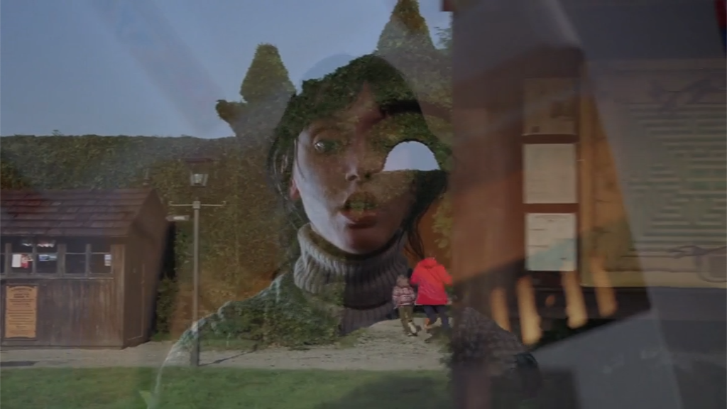 There’s also an interesting relationship between the format of what’s on the page, and what’s going in the mirrorform. So, the first three pages are Shakespeare-style, and that goes with the shot of Jack pointing at the east, and showing the Caesar-referencing newspaper. This north-pointing shot (see below), switches to a more prosaic style for two pages (with the typewriter gone from the shot). Then, as the shot begins to transition to Wendy and Danny running for the maze we get two more Shakespeare-esque pages. Then there’s the page we’ll look at in the next cluster of analysis, where pyramidal form-poem style writings seem to curve perfectly with the shape of the exterior building. Then three more Shakespeare-style while Wendy and Danny run up the path to the road. Two more prose style while they cross the road. Two more Shakespeare while they run along the hedge maze wall. And finally one more prose as they enter the maze.