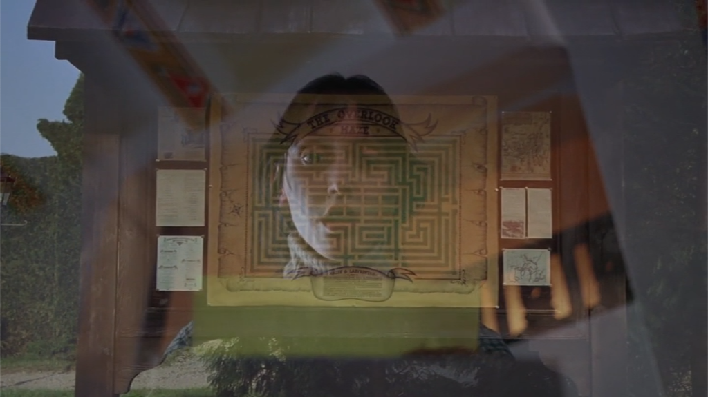 The hedge maze map here matches the one forward Jack is about to study in the lobby, but neither matches the actual labyrinth, which we’ll see in an aerial shot, with its own, much larger and more complex design.