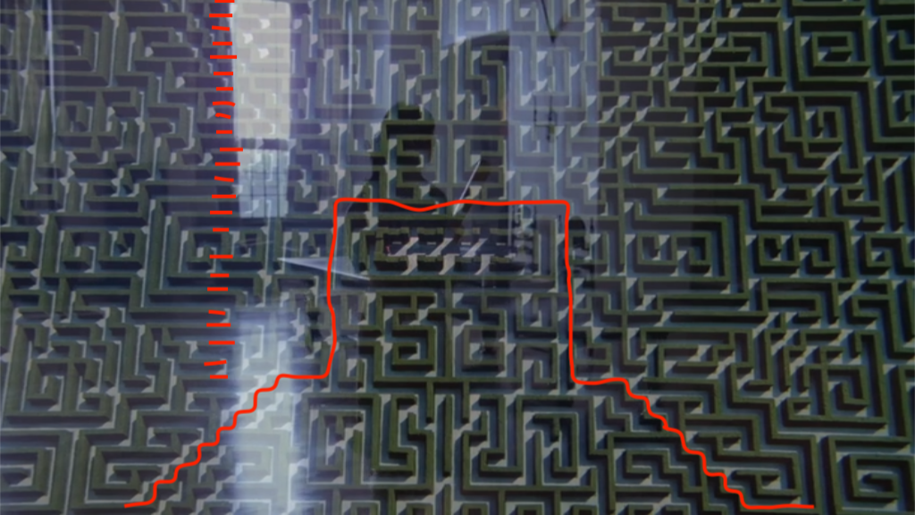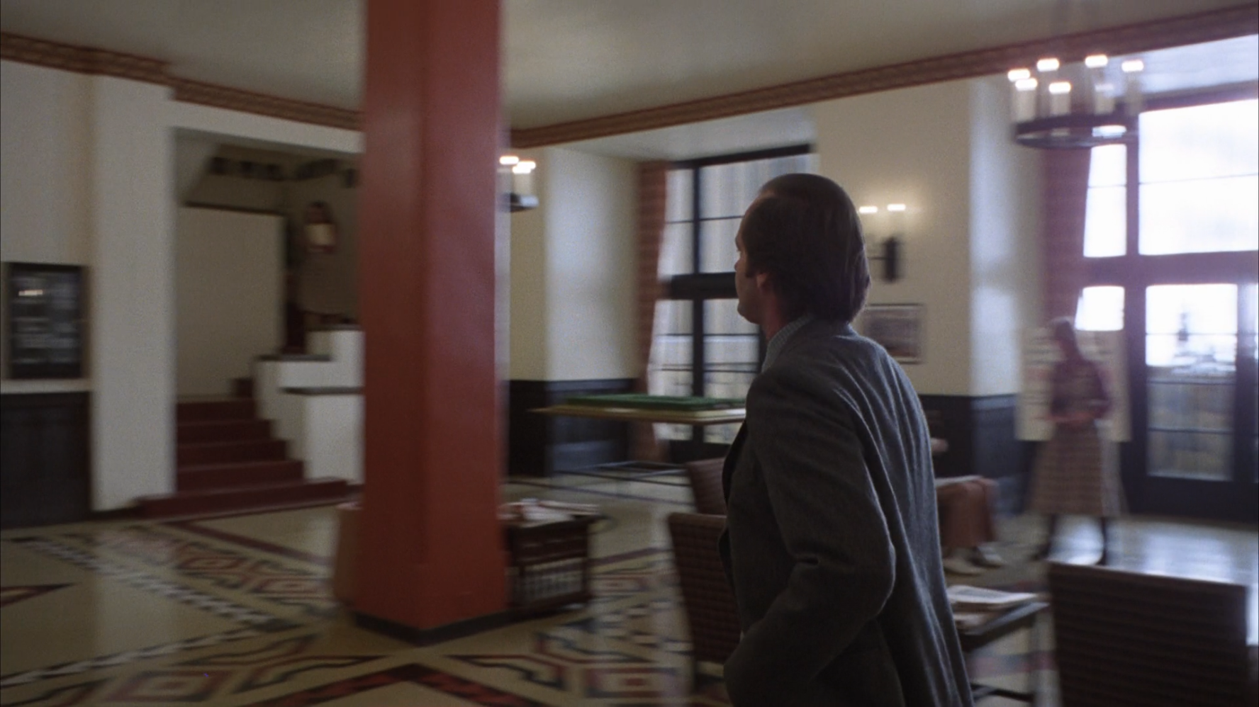 It’s hard to make out, but the CAMERA WALK poster, which is behind backward Wendy in this shot, is hovering right over the model maze here, which is exactly where the CAMERA WALK poster was when Jack first entered the building (see below) for the interview (him grabbing his head here almost says, “What was it that used to sit right here…? Seemed important for some reason” — and recall that the image on the poster was the “summer” photo of Mt. Hood, which corresponds to Paul McCartney in the Let it Be analysis, who corresponds to Jack, so it’s as if Jack can’t find himself anymore, and what’s in its place is this liar labyrinth).