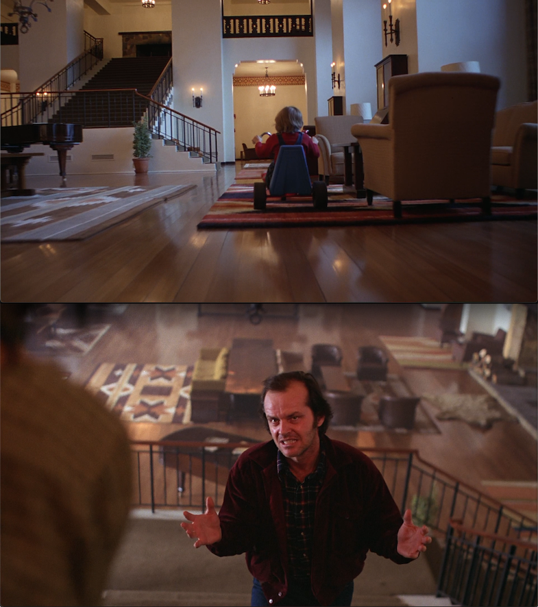 Oh, and speaking of the giant rugs inverting, in Danny’s world the silver rug is south, while Jack and Wendy pass the gold rug at the south. The last time we saw Danny’s trike it was white, and now it’s red. So there’s a parallel colour swap there. And for those who recall that Jack’s typewriter will also do this, that scene will mirror over the lounge fight too in a second.
