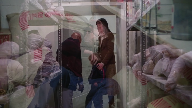 He awakens just as backward Danny gets his last REDRUM shine. So this pairs nicely with the fact that, in the backward, Jack and Wendy have just been talking at the spot in the lounge by the typewriter where Jack had his dream about murdering her and Danny. This is like the soft version of that. In fact, of Jack’s three natural wake-ups from natural sleep (see below), note how the one overlays with REDRUM, the second looks almost like he’s looking in mortal terror at the man he will murder, and the third overlays with Hallorann listing off the 191 bags (I counted) of dead meat. And note the relationship between the first and third overlay: in the first forward action, Jack is about to be served some of that dead meat, and in the third forward action, Jack is in the place he’ll be released from when Tony/Danny starts writing REDRUM.
