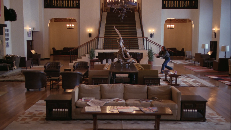 Jack mocks Wendy for being concerned about the welfare of her son over the welfare of her husband, but in the beginning we see Wendy is allowing Danny to roam free, at 5 years old, around this vast, draughty, old building (with random equipment lying around everywhere), while she cooks and serves breakfast to Jack, alone. This first 37-second shot of Danny performing his loop around the lounge starts exactly beneath room 237. The 23-step stairs to his right here end one floor up, a 3-second walk from 237’s front door. And this loop will end right back here, seconds away from the most dangerous room in the Overlook. Incidentally, this first shot of Danny in the post-CLOSING-DAY Overlook bears remarkable resemblance to the last shot of him in the Overlook, where he’s fleeing from the steel drawer behind the lobby. (It was analyzing this moment that lead me to my theory about 237s that you can read here.)
