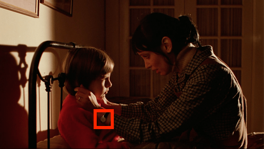 The button on Danny’s red undersweater here, on close inspection seems to just be a round button, but in this shot, it always looks like a maple leaf to me. Again, recall that a major percentage of the artwork in the hotel is by Canadian artists, and that Hallorann is murdered under the watchful eye of AY Jackson’s Red Maple.