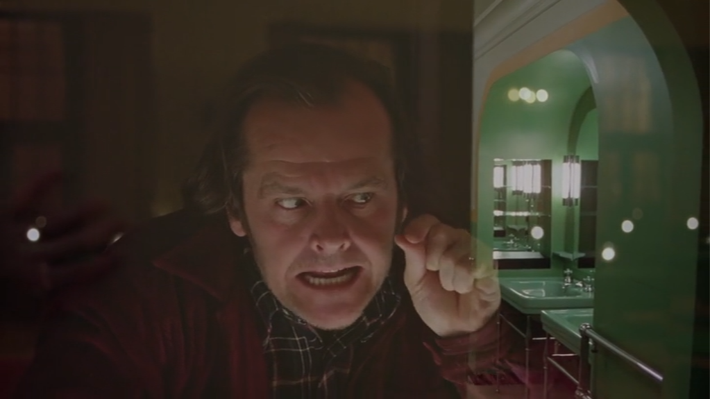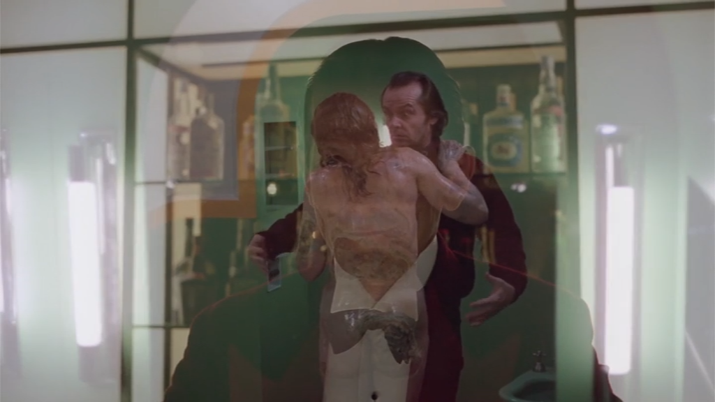 This is one of my favourite mirror moments. Jack is arguing with himself that the line between being labelled an abuser and being regarded as a good man is so thin, it can be crossed by the most minute amount of energy. And that’s true of course, as shown here by his hand gently and slowly pushing back the door of the 237 bathroom. Jack’s defence case is just about wrapped up, here, and what’s the very next thing he does? He goes and makes the most car-crash-in-slow-motion sexual violation of his marriage imaginable. And 3 minutes go by between him opening the bathroom door, and him getting freaked by the age-jump. So Jack is showing himself capable of more than just thoughtless, split-second crimes against his family.