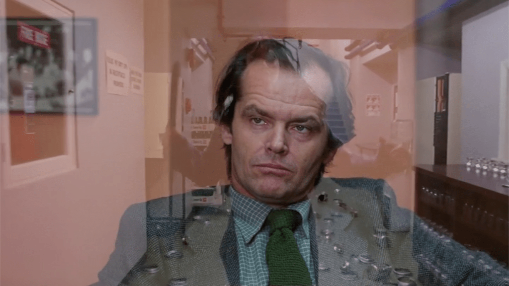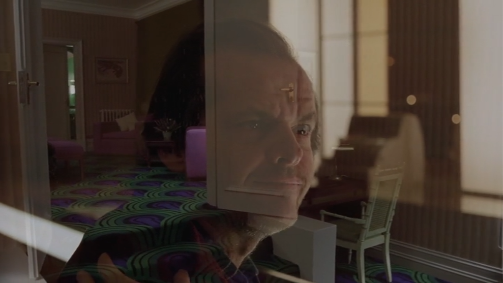 There’s so many moments in the film where you want to say, “And that’s where Jack really, truly, finally died.” You want his death to feel inevitable, but you also want to chart its course. In reality, Jack was not dead until the moment he became a meat popsicle in the snows of the labyrinth. Which, it so happens, is 2 minutes to the end of the film. This moment, 4 minutes to the middle of the film, and 3 minutes to Hallorann’s middle sequence, is probably the closest visual twin of that moment, and it’s just after ingesting the drink. This pairing nicely shows the one-two punch of the drink and the ghost kiss. The drink set him up, the kiss knocked him down. In fact, Jack even says something like that, “You set em up and I’ll knock em back, Lloyd, one buh one” and it’s like he’s describing the ways the ghosts fuck with him.