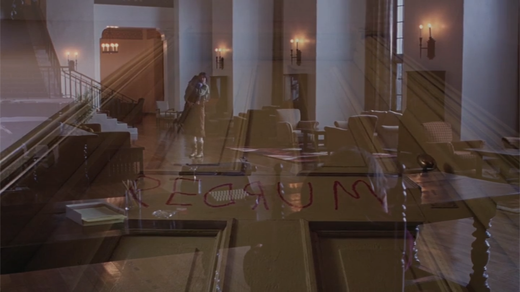 REDRUM written atop Jack. The form of the door cross also gives the impression of an inverted cross, which is not specifically Satanic, but certainly associated with the cross of St. Peter. Kubrick’s fandom for The Exorcist and Rosemary’s Baby, might mean that he meant it as an unholy symbol…and it might be wholly unintentional. Nonetheless, crucifixes are murder weapons, so REDRUM’s appearance here seems apt.