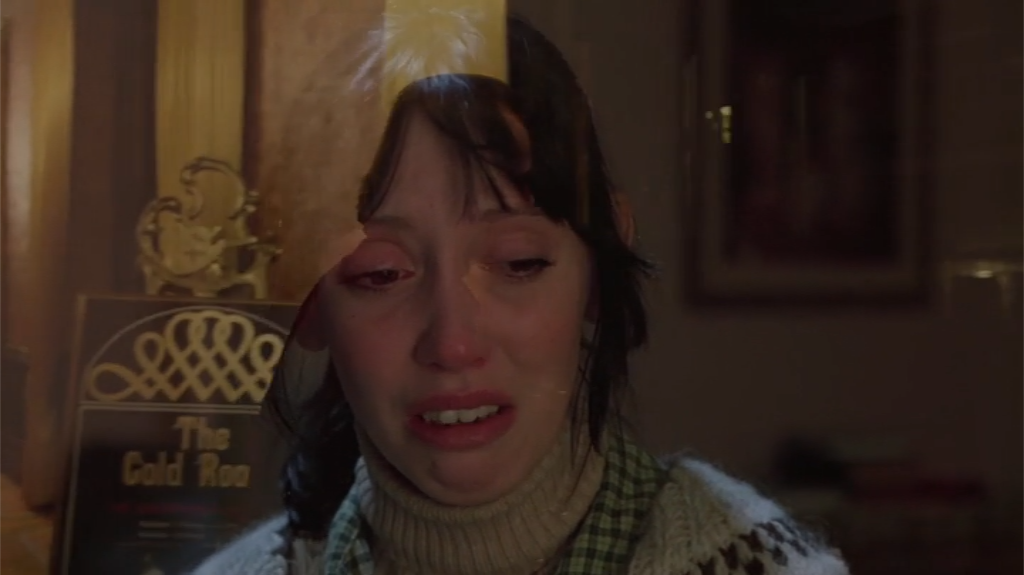 Here, backward Danny is overhearing Jack say to Wendy that Danny probably put his giant bruises on his own neck, while simultaneously having a vision of REDRUM, and forward Jack is reacting to the accusation of abuse with understandable confusion. Both father and son are wrongly accused, it must be said. But their reactions couldn’t be more different. In the next moment, Wendy calls him a son of a bitch, and shouts “How could you?!” while backward Jack is comparing Danny’s self-infliction with the “episode he had…before we came up here”. Wendy’s outrage feels a little more worthy there.