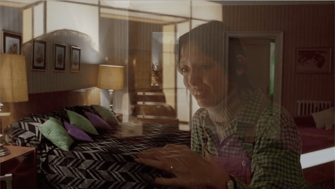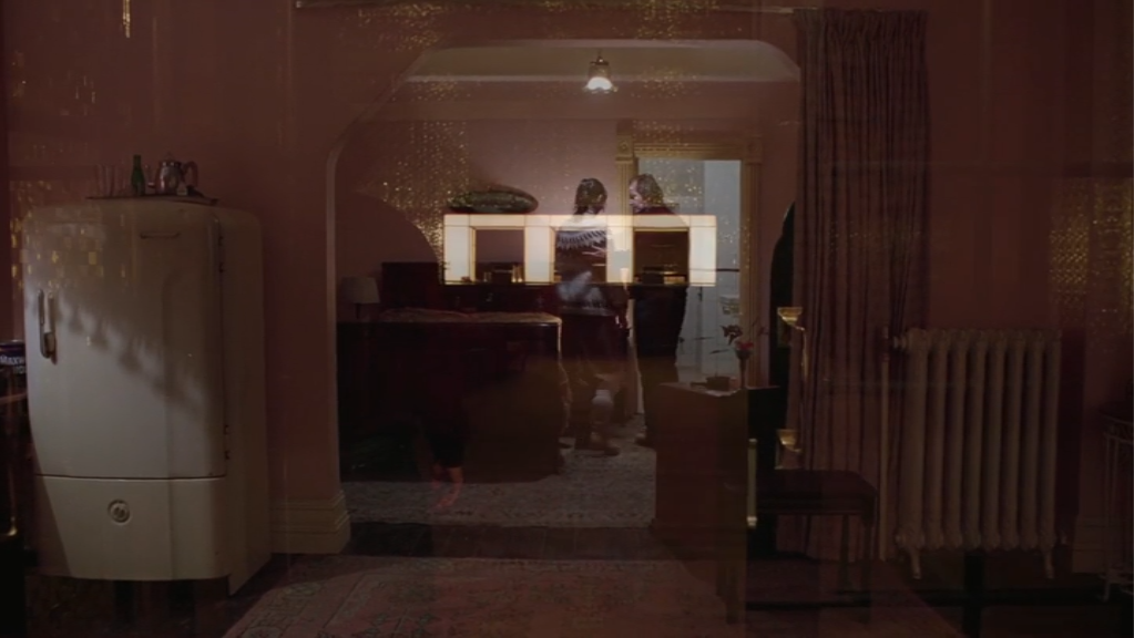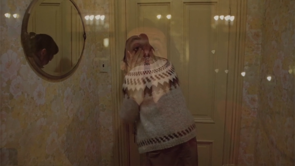 In fact, this is a good moment to point out one of my favourite things about the mirrorform, which is that it gives you a quick way to be sure about unusual phenomenon, like something very subtle that just happened. The lamp inside the room here is golden-hued, right? Well, when Danny was approaching the room the first time, it was a pink lamp (see below), and the reason we can be so sure is in part thanks to how the mirrorform shows us the different scenes that reflected over these two moments.