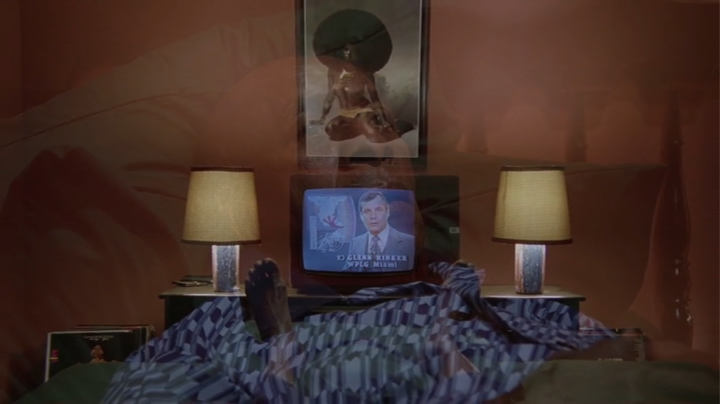 The two minute middle-movie, as I call it (110 seconds, technically), is amazingly self-encapsulating. Hallorann’s TV roars to life, and at the same time, so does his face, receiving Danny’s shine, as though seeing the face of a celestial being. One of the first images he sees is this plane in the Channel 10 News Intro, not unlike the one he’ll fly to Danny’s rescue.