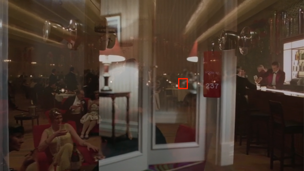 Note how the lesson key shows up in the mirror here, almost in time with Wendy’s emergence. The mirror is “throwing” the image of the lesson key into the space that room 231 would be occupying through the wall, so I like that it mirrors over Jack being at the bar. It suggests the way that the hotel has a different set of lessons for him.
