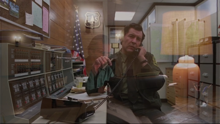 The bulk of Jack’s screams play over the scene of Hallorann first talking to the forest service about getting in touch with the Torrances. The ranger vaguely resembles Nicholson. There’s also an American flag next to the ranger, and hanging above Jack in the lounge. The American flag on Hallorann’s radio also overlaps with the lounge flag.