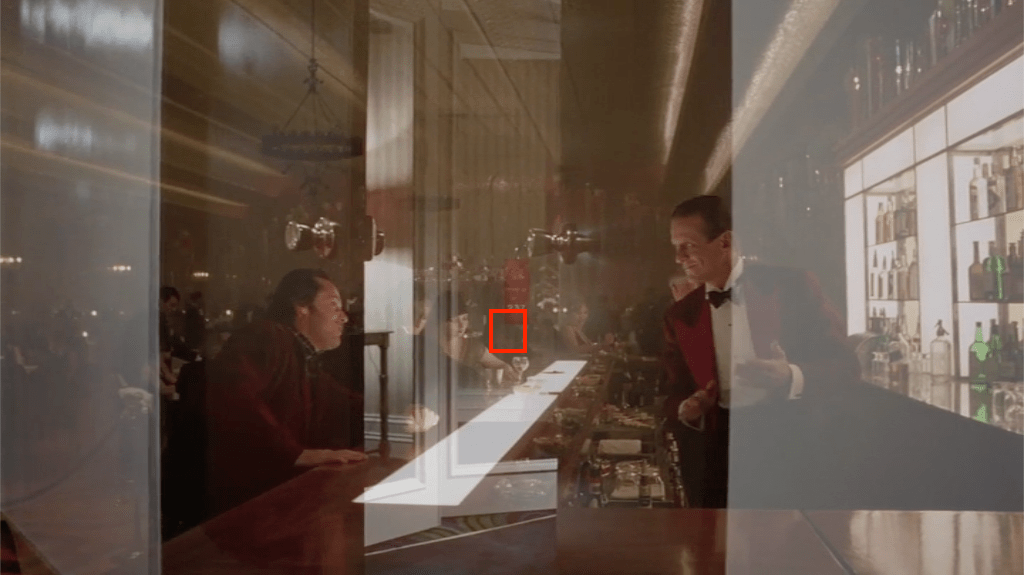 As backward Wendy is saying “What about those bruises on his neck? Something must’ve done that to him.” Jack is passing into the Gold Room for the first time, to drink the only two drinks he ever drinks in the film. The drinks that kill him, essentially. So, are we to think that it’s the Gold Room’s fault? I’m happy to blame it all on the Gold Room. (Also, an old slang term for booze was neck oil.)