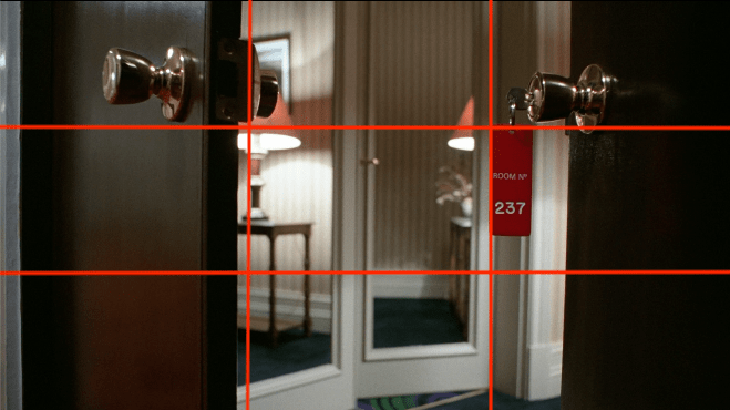 But Kubrick didn’t stop there. Because it’s a pink ball from a ghost that lures Danny into 237, and it’s a ball of ghosts in the Gold Room that lures Jack toward his doom. As Wendy remarks right before entering the Gold Room for the first time, “Pink and gold are [her] favourite colours.” Now, check out the two lamps inside 237 next to the mother-son/father-son paintings (see below). Father gets pink, mother gets gold. Now check out how the static shot of the gold lamp from Danny’s vision matches up with a phi grid framing, and the moving shot of Danny entering the room is a rule-of-thirds composition (see below again, sorry). Since phi grids show the “realness” of something, and rule-of-thirds heightens that sense of reality, I’m thinking that pink equals “fantasy” and gold equals “reality”. Now compare that to the paintings; this would mean Jack is more the “fantasy” person, and Wendy is more the “reality” person. There’s lots more we could say about that (pink and gold and also the dominant colours of Suite 3 – gold in Danny’s room, pink in the Jack-and-Wendy space, with a mixture floral pattern in-between), but you get the point. The mirrorform is not just a way to understand how each moment relates to the opposite moment, it’s also a way to see how vaster networks of clues interrelate.