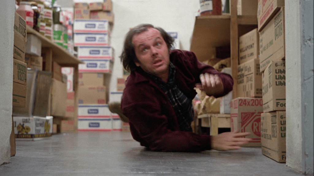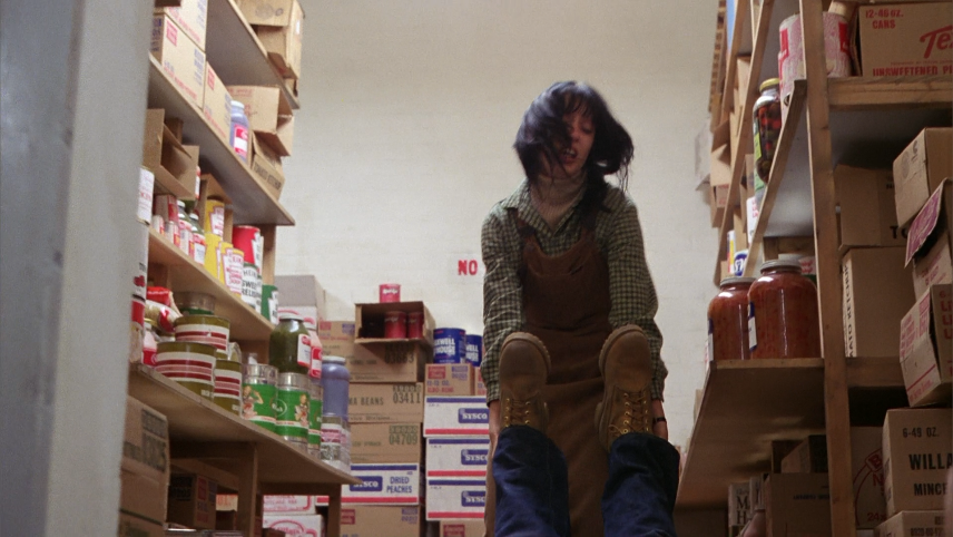 - 4) This story of The Shining, is like the storeroom that could allow you to “eat up here a whole year and never have the same menu twice”, it’s about what happens when you have everything you need to survive, forcing your mammalian brain out of the usual Darwinian nature of existence. There’s no need for conquest or war to get what we need, famine is a non-issue, and death is but a distant dream, thanks to all this storage (and on a personal note: I’ve been watching the film several times a day, in a sense, for 13 months, and I still haven’t run out of things to discover, which has constantly reshaped my view of the narrative–I rarely have the “same menu” twice). As Ullman says, Jack’s job is not “physically demanding”; he exists here so that the “elements can’t get a foothold”. And when Hallorann emerges from the story room, he’s basically stating the thesis of the film (or one of them). “You know, Mrs. Torrance, you gotta keep regular, if you wanna be a-happy.”