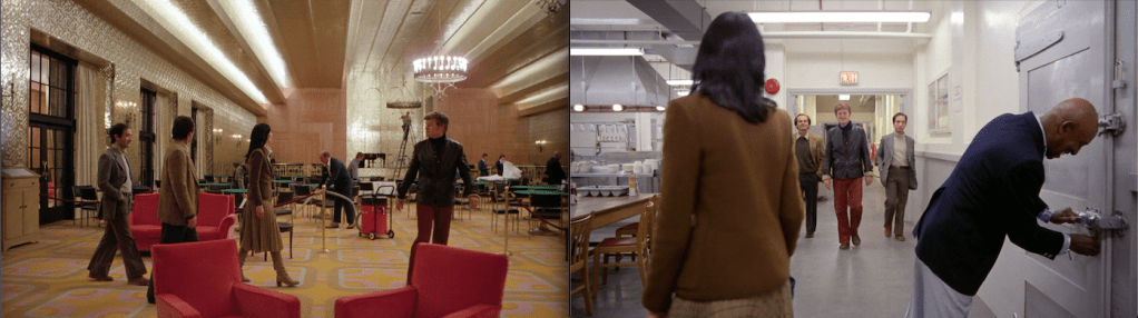 And just so I don’t not mention this: I’ve had some people ask me, well, do you think the cast and crew knew about this, or could this be like an H.H. Holmes thing, where he made the production so confusing that nobody would’ve noticed his chicanery? Well. Danny, Dick and Wendy are all seen walking out of the deep freeze. They were inside, and then they walk out. But this door had to physically open on the actual storeroom, which we see from the context of the larger kitchen 3 or 4 times. So the actors had to have seen that they were walking out of an impossible room, here. Maybe it was explained to them in some clever way…but they knew.