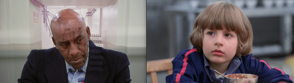 The sequence between Danny and Hallorann that follows is exactly 297 seconds (29:13-34:10). And 237 + 23 + 37 = 297. So there’s the temporal fact of Hallorann’s epic 10-minute sequence having two perfect halves, and there’s the nature of those halves. In the first half, everything’s rosy and “Hey, I’ll just show you how this place can shift around impossibly, in case you need to run through a labyrinth later that rotates its entrance 90-degrees.” And in the second half, things get a lot more grave and 237y. Danny’s eaten his ice cream, but he’s still got concerns.