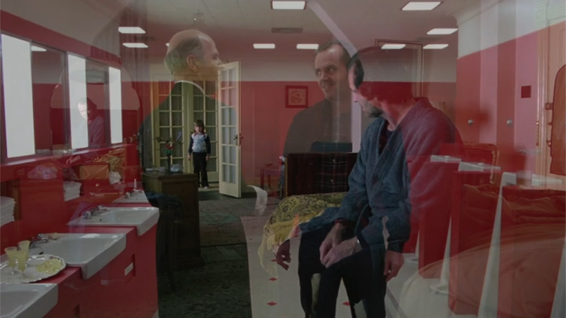Also, and much more significantly, this is halfway between the beginning/ending and the middle of the movie, the 1/4ths-3/4ths mark of the official film. This is neat because exactly one second from here we get the big shot of Jack in a huge mirror. Jack’s seen in numerous mirrors, of course, at numerous times, but never this prolonged.