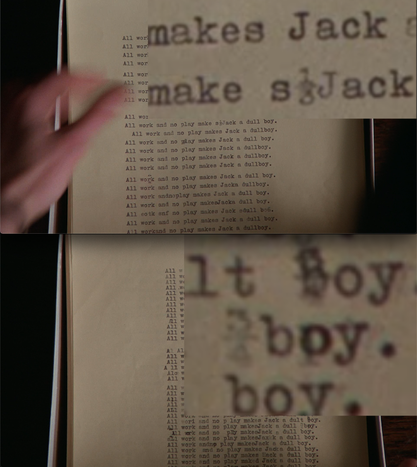 Still, if everything I’ve noticed here was pointing to what I’m assuming it points to (the fractions equalling timecodes; the Buenos Aires phonebook and horseshoe pointing to Hitler) was Kubrick messing with us? If he does think Hitler died in the war, was this all a blind alley for the eye screamer? Or to look at it the other way, if the typos were meant to be interpreted as nothing but chaos, why are all the other typos in the All Work papers so easy to attribute to the surrounding keys? It’s certainly strange, if nothing else.