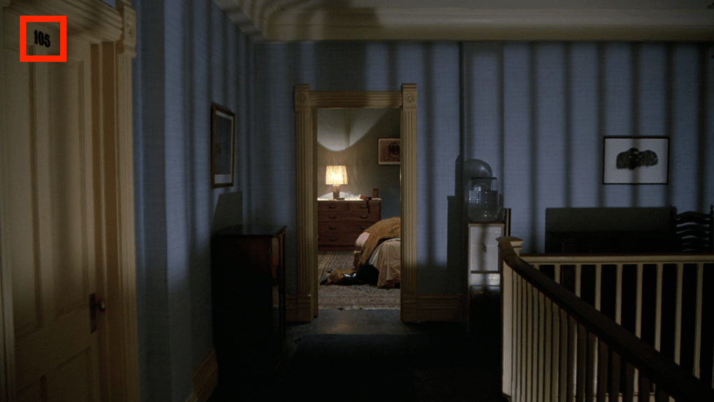 Actually, holy shit, the only other time he’s seen in the Suite 3 mirror is 15 seconds past the halfway mark between the 1/4ths-3/4ths mark and the middle moment, which would make it the 3/8ths-5/8ths mark. (Incidentally, these two scenes are 82 and 23 seconds long each, for a total of 105. When Wendy is seeing the blowjob bear, there’s a suite close to her perspective, looking down the hall, called 105. I’ve never had any idea why it might be numbered that before now. But that would gel perfectly with my concept that the BJ bear is a “reflection” of Wendy.)