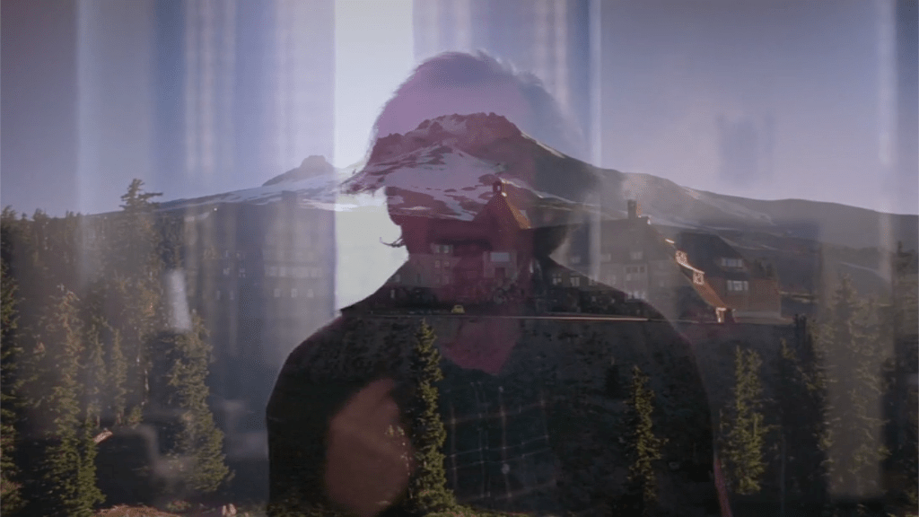 And just in case the shot of the Torrances driving past Alder Creek seems like the least mirror-based of all these moments, recall that the final shot in the driving to the Overlook sequence features the car a few hundred metres further back on this same curve of road, about to cross Alder Creek again. And also, this second set of Overlook approach shots features the car driving on the opposite side of the range that the first set of shots showed it driving up (which would be a rarity if not a completely ridiculous concept for something as short as a “25-mile stretch of road” high up the side of a mountain like this–in reality, the second set of shots show the car driving the opposite way down Going-to-the-Sun Road that the opening shots show, so there’s that mirrorformity too–I’m not saying I’m definitely right about the two mountainsides bit, but I’ve driven through large parts of the Rockies, and I’ve never seen anything like it, have you?).
