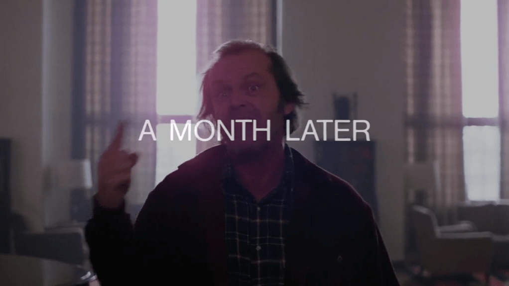 In Redrum Road, there is, simply, Round 2, the middle third of the film, which starts after Jack’s just bit Wendy’s head off for interrupting his typing, and which features him about to do his first killing (of the radio). So that movie-wide technique divides the Jack who’s only heard about the Overlook making people kill, from the Jack who will be encouraged by the Overlook to kill, from the Jack who will kill.