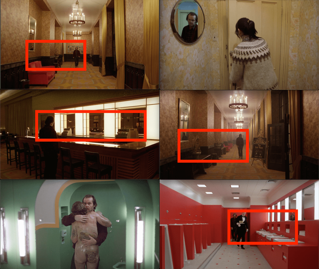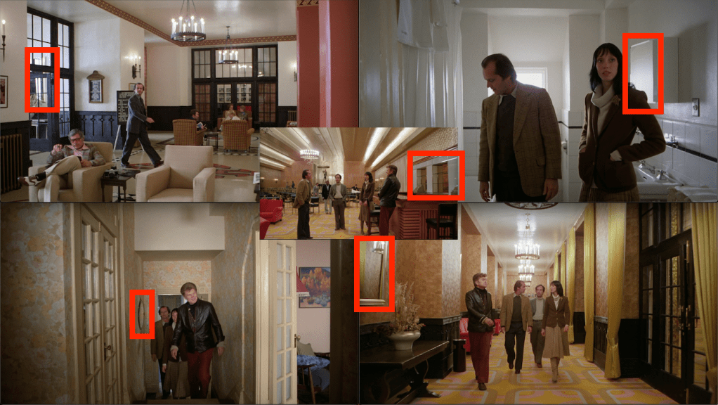 So this middle-middle, this looking glass’s looking glass, is what we’re passing through. And besides the 105 seconds of time that Jack is lengthily seen in those two major mirrors, there’s seven other moments where he’s seen fleetingly passing a mirror (I cut out one of the other Gold Room entry mirror passes for the graphic).