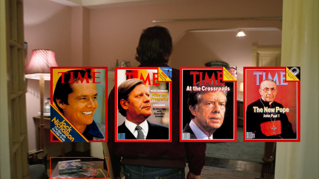 The notion of “time” might be intended to remind of the various time-based subtexts throughout, like the clock hands analysis in the Treachery of Images section, or the one-minute to midnight part of the Masque of the Red Death subtext (in which case it might be offered as an explanation for why Jack’s attack is happening at all, which would illuminate the death/time element in my fifth horseman analysis). The time codes in the various songs that play in the film are richly significant, with the editing on the song in this scene being one of the most complex cat’s-cradle efforts in Kubrick’s canon, so far as I’m aware. We should probably also consider the one second this magazine is ever visible: 122:35 or 2:02:35. That’s 7355 seconds, which looks like another 237 jumble. But that 22:35 element from both time codes also reminds me of the There’s No Place Like Home study, where we found the connection between the 22-41 images and the 22:41 moment of Jack and Wendy setting foot in their future domicile, which Jack is stepping into in the same way here, though in much different spirits. At 22:35-22:37, Jack was first peeking into Danny’s future bedroom and saying, “Perfect for a child.” There’s a couple unconfirmed art objects in this moment of a couple bears dancing and a snowy landscape of some kind. Perhaps these will reflect on the concept of “time” and things (like The Wizard of Oz? like the new pope?) being “perfect” for a child.