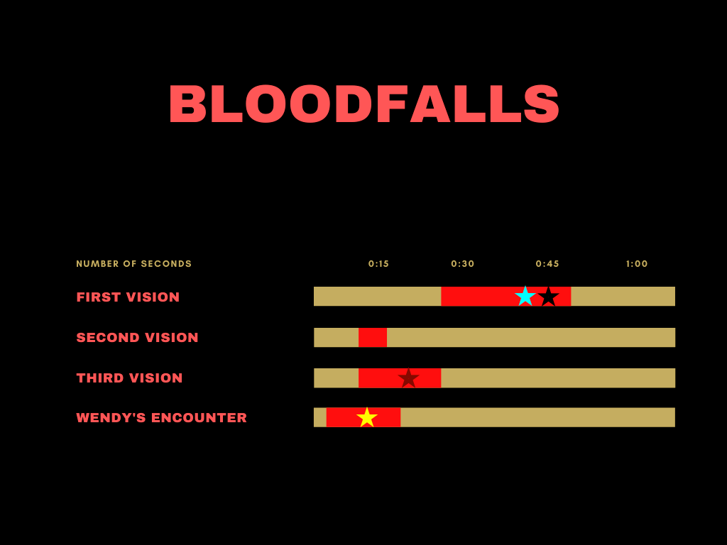 And if we zoom in on the seconds from just these bloodfalls, and these gaps, it goes 2 seconds no blood, 17 seconds for Wendy’s vision, which includes Danny’s shorter visions, 7 seconds of just the third vision, 23 seconds for Danny’s first vision, and then 17 second no blood outro.