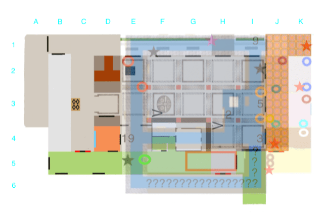 So, the first thing I did was make this little graph. The ghostly blue square (Section E-I and Section 1-6) is the halls outside Suite 3, as they would float above the main part of the lobby, and Suite 3 itself is floating ghostly above the path to the Gold Room. The exact placement of the Suite 3 region is off because Kearns didn’t factor for the difference between where the door to Suite 3 starts, and where the main part of Suite 3 begins, but I also made the mistake of not correcting for that when I placed the rings to mark the artworks. Anyhow, it makes little difference.