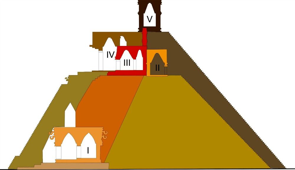 And let me say, before we move into the final phase of this analysis, that just as the Tower of Fable gives us one floor built upon the next…and just as Ullman tells us that a decorator from Chicago (Frank Lloyd Wright?) was brought in “just last year to redecorate” the Gold Room, suggesting a kind of soft burying of the Overlook’s history…these pyramids were often built upon older pyramids, as the Pyramid of the Moon was. Or, as depicted by this cross-section of the Pyramid of the Magician, some were always intended to be like this.