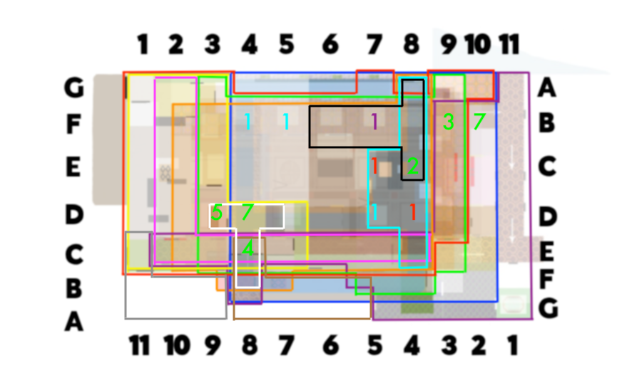More recently (Sept. 2020) I made a version of the map that attempts to combine much more of what the analysis below will get into. In this version, every area of the hotel is shown where evidence suggests it’s meant to appear (the only place where I slapped something arbitrarily is the boiler room, which I put in the bottom left corner, just because it was the only part of the map that didn’t have anything in it, and it was the only internal room left to plop somewhere). I’ve also run the letters and numbers backwards and forwards across both sides because I’ve found evidence suggesting this could be the way we’re meant to think of everything. I’ve silhouetted the various areas in colour bars that refer to the areas like so: