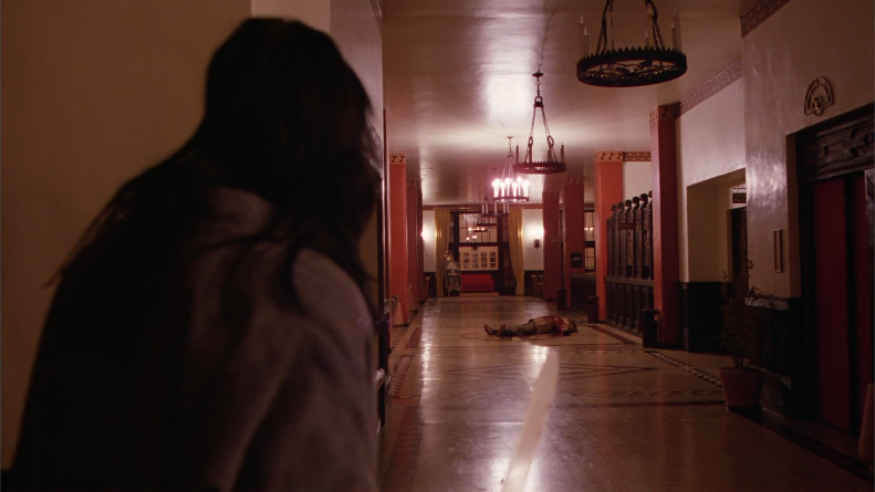 As I’ll discuss in greater detail elsewhere, rabbits are associated to shiners, and Bugs here appears on the spot where Hallorann will get axed later. The black bear seems to be correlated to Ullman/The Overlook, so having Bugs be on top of Hallorann’s future corpse, and to have Winnie up the hall, and the black bear (or is it a golliwog?) on the side of Ullman’s office brings to mind the moment of Wendy witnessing Hallorann’s corpse.